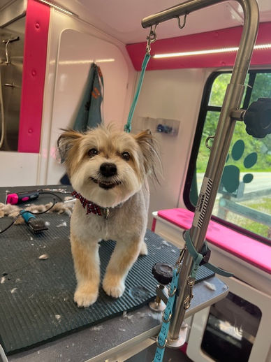 Boujee PawPaws Luxury Salon Bus is a complete spa experience designed for multiple pets from the same household, large pets, pets requiring a longer groom time, pets with disabilities or needing special accommodations, pets who require de-shedding or de-matting services, creative grooming clients including custom coat coloring and airbrushing, and specialized spa services such as nail painting. Our grooming bus features two grooming stations and in most cases, you will have two groomers at every appointment creating a relaxing, safe environment.